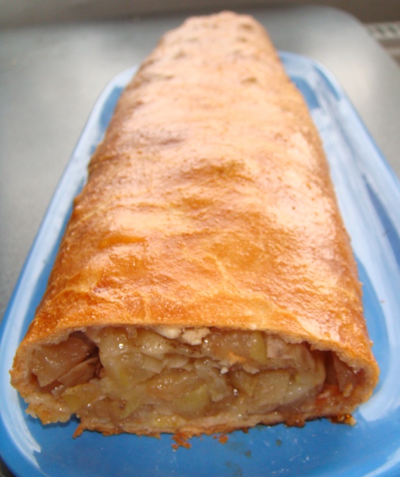 Яблоки почистить, нарезать мелкими кубиками. Тесто тонко раскатать, посыпать сахаром и корицей. Насыпать яблоки и миндальные лепестки:
