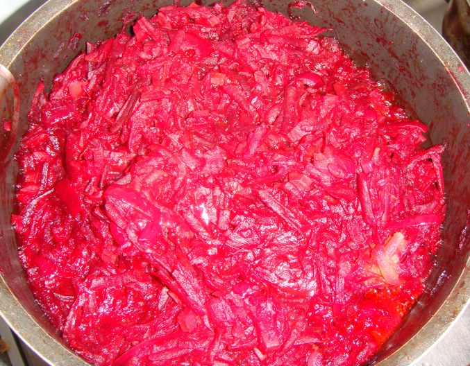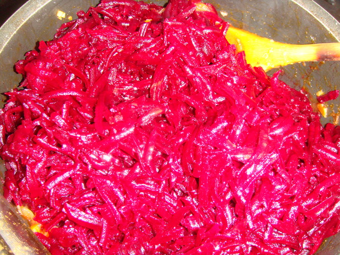 и натертую свеклу. Посолить, добавить сахар, красный перец, уксус: