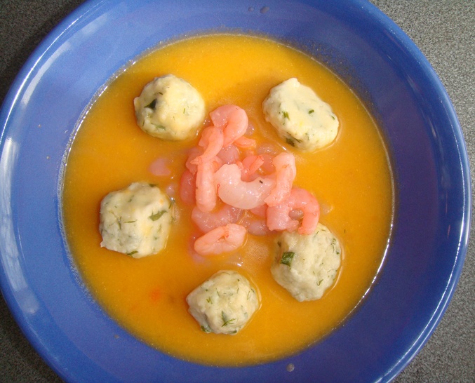 Суп разбить блендером, всыпать 300 г мелких чищенных креветок и закипятить. В тарелку выложить клецки, залить супом: