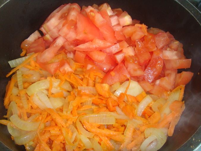 Отварить в кожуре 600 г свеклы. Очистить, натереть на крупной терке. В сотейнике спассеровать лук и морковь, добавить мякоть помидора: