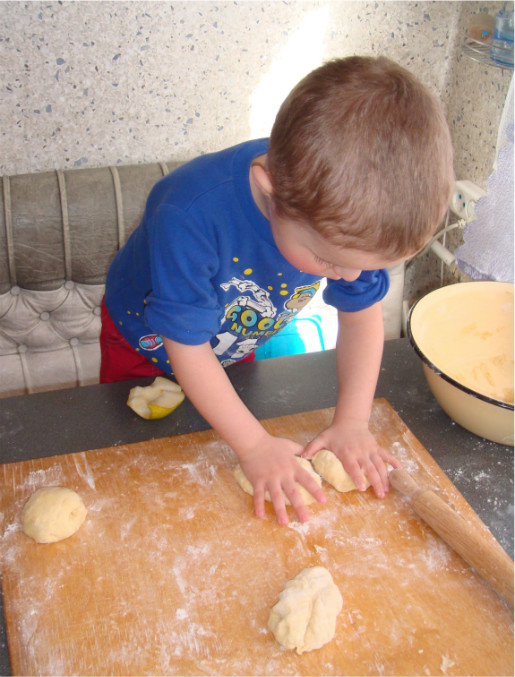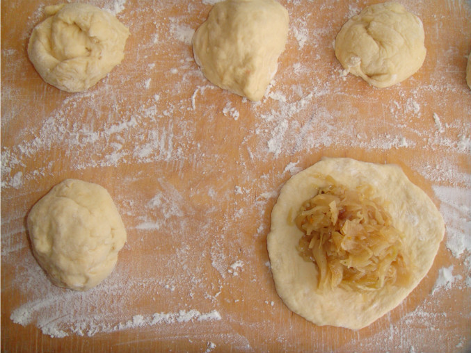 Для теста 500 мл кисломолочки (сметана с водой, кефир, простокваша и т.п.) смешать с 0,5 ст. сахара, щепоткой соли, 2 яйцами, 1 ст.л. сухих дрожжей и мукой. Вымесить гладкое тесто. Дать ему подойти в теплом месте под салфеткой. Разложить на подпыленной доске комочки теста: