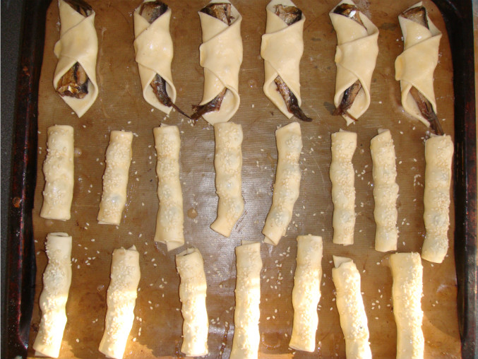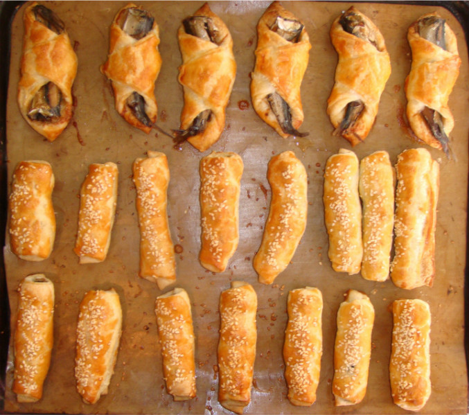Раскатать пласт слоеного бездрожжевого теста, нарезать на квадратики (на них выкладываем шпротинку и заворачиваем конвертиком) и прямоугольники (на них выкладываем оливки без косточек):