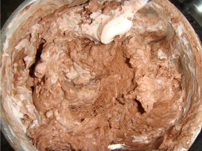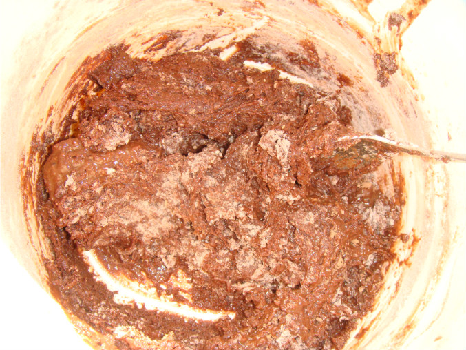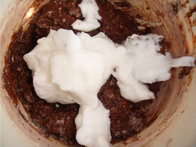 Взбить 3 желтка с 1 ст.л. сахара, добавить растопленный шоколад и сухую смесь: