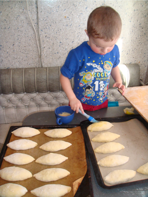 Защипать края, сформировать пирожок, дать подойти на противне, смазать разбитым яйцом: