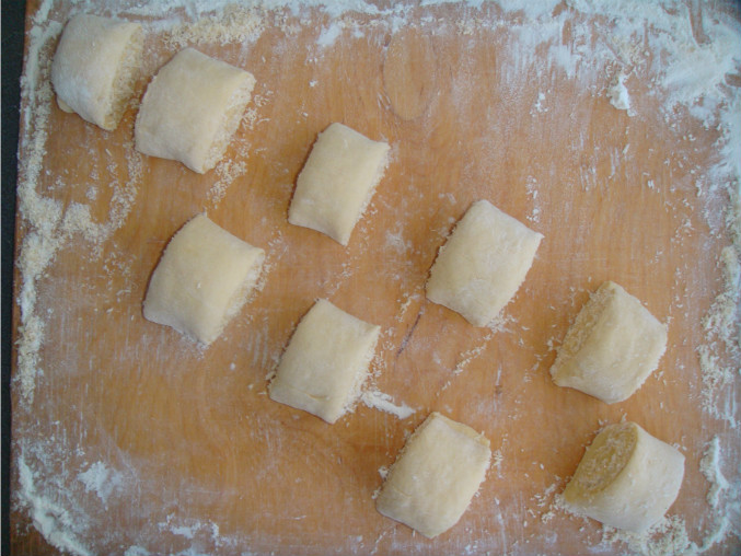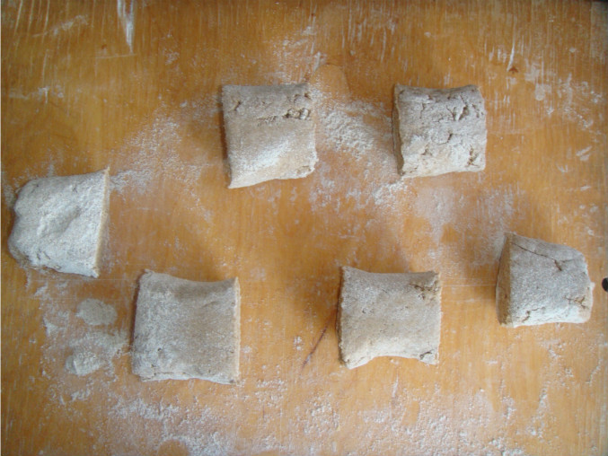 Из ржаного теста формируем колбаску, нарезаем ее на кусочки размером с яйцо: