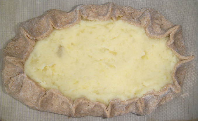 Раскатываем тонким овалом. Укладываем сверху начинку: