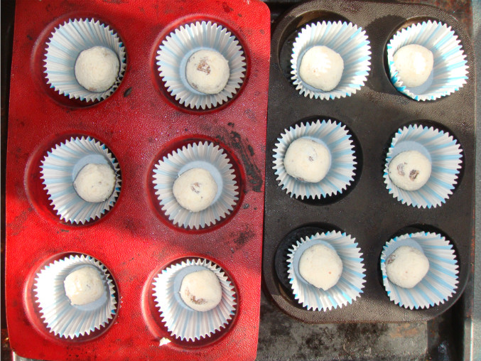 Перемешать и разлить в формы, поверх шариков. Выпекать до готовности: