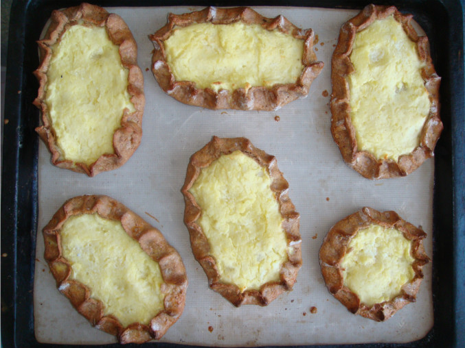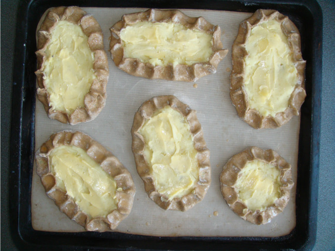 Перекладываем калитки на противень. Можно смазать разбитым яйцом, а можно этого и не делать: