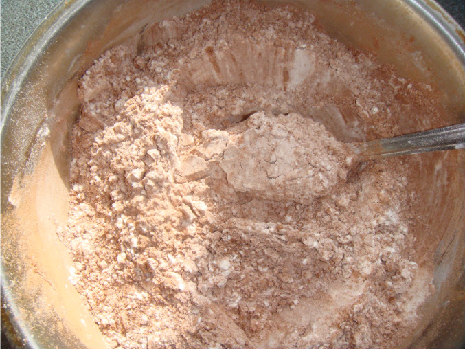 Смешать в миске 150 г муки, 2 ст.л. крахмала, 1 ч.л. разрыхлителя, 3 ст.л. какао: