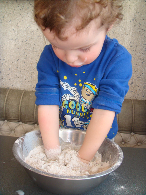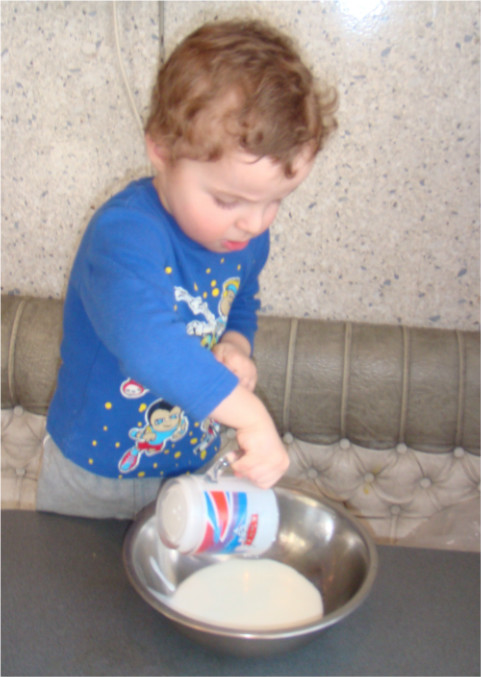 1 стакан кефира и полстакана воды перемешать (у нас этим с удовольствием Вовик занимается):