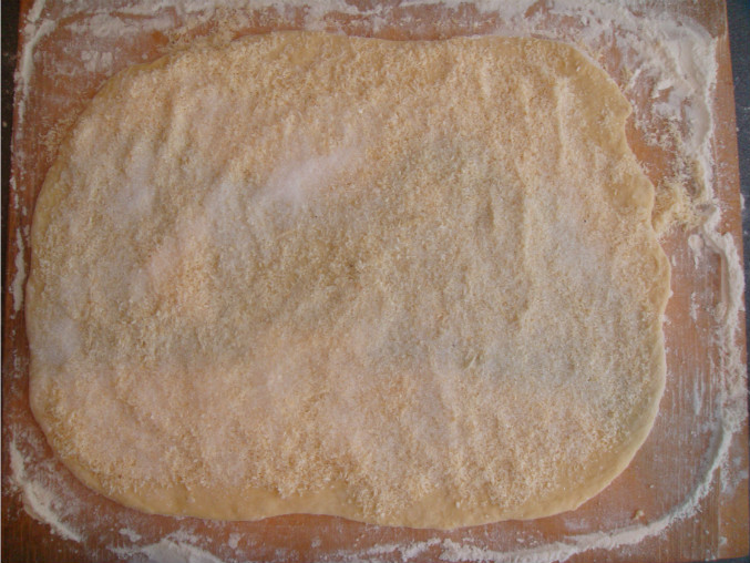 Из этого же дрожжевого теста раскатать тонкий пласт. Посыпать сахаром, ванилином, кокосовой стружкой: