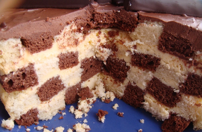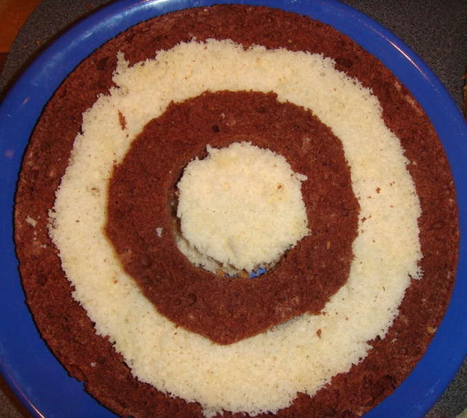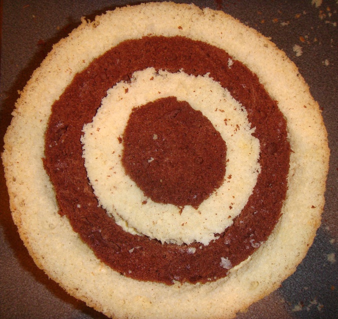 Испечь 2 бисквита (взбить 4 яйца с 1 ст. сахара, потом добавить ванилин, 1 стакан муки и перемешать лопаткой, не взбивать!). Для черного бисквита использовать пол стакана муки и полстакана какао: