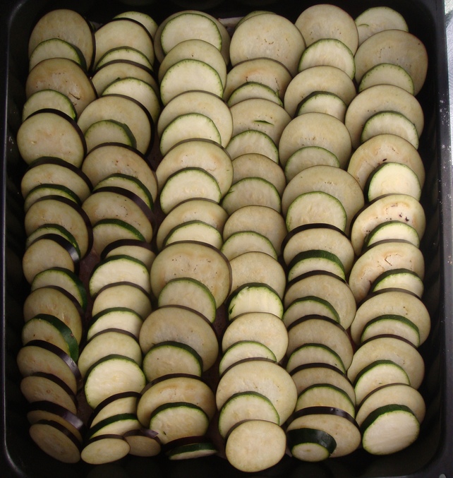 Рыбу посолить, поперчить. Приготовить баклажаны, кабачки, цуккини: