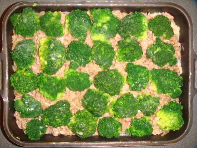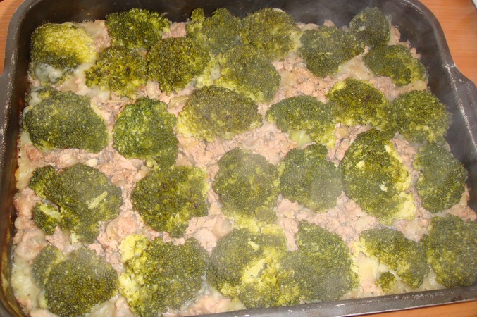 Сверху воткнуть кочанчики брокколи. От размороженной капусты и лука в фарше достаточно жидкости для сочности: