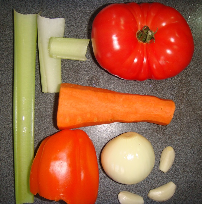 Подготовить овощи - лук, чеснок, сельдерей, морковь, помидор, перец: