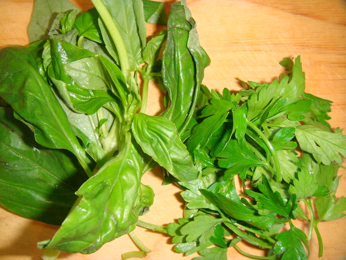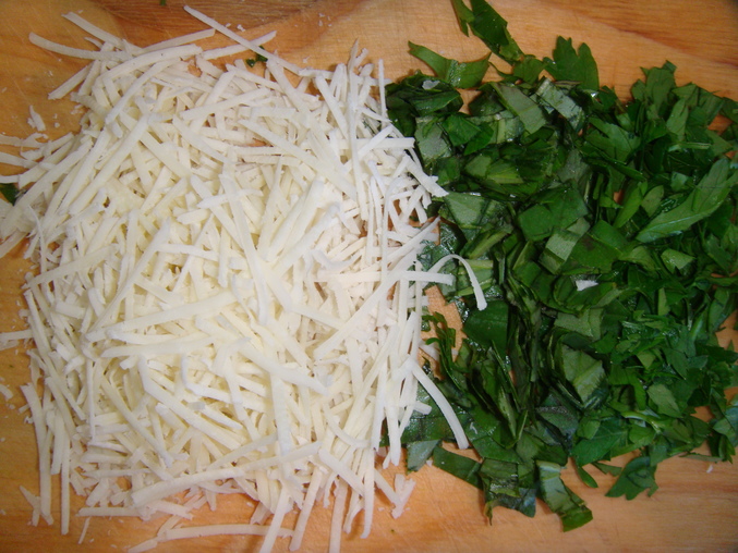 Зелень порубить, сыр Пармезан натереть на мелкой терке: