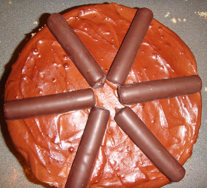 Сложить все слои. Обмазать торт сверху и сбоков. Сварить шоколадную глазурь (1 ст.л. какао, 2 ст.л. сметаны, 3 ст.л. сахара вскипятить и остудить), обмазать ей торт сверху. Украсить по желанию. Иногда это фигурный шоколад, иногда плавлю шоколадки и делаю фигурки шахматные. В этот раз у меня шоколадные палочки с творогом: