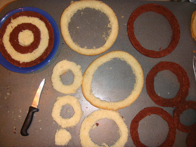 Коржи остудить, разрезать каждый на 2 пласта. Затем на равное количество кругов: