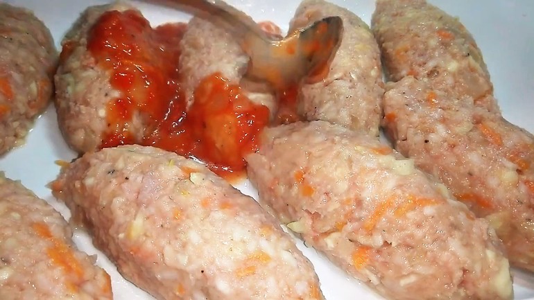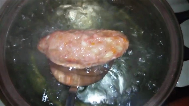 6) С фарша мокрыми руками формируем голубец, удлиненной формы, и с помощью шумовки опускаем в кипящую воду на 20 секунд.
