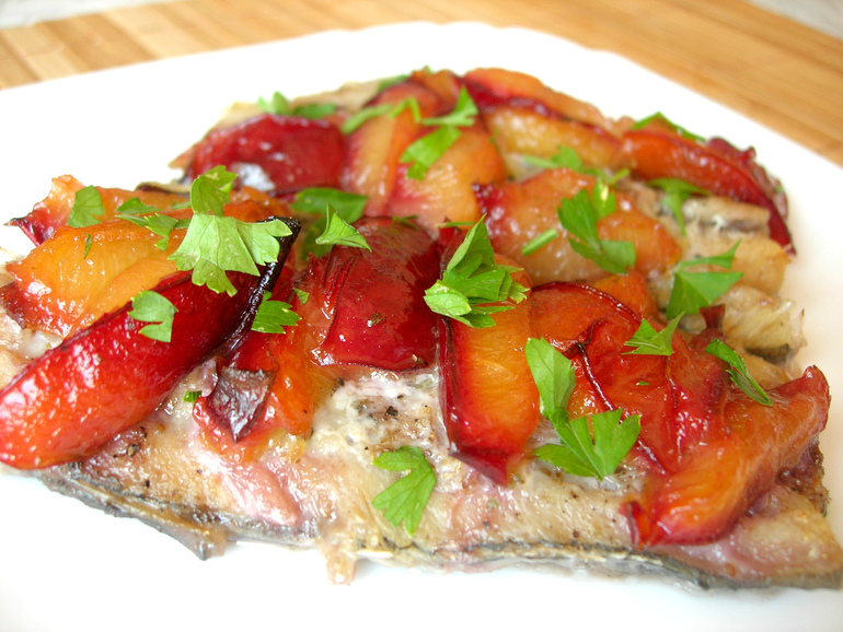 4. Каждое филе солим, перчим, посыпаем кориандром и выкладываем сверху соус из слив.
