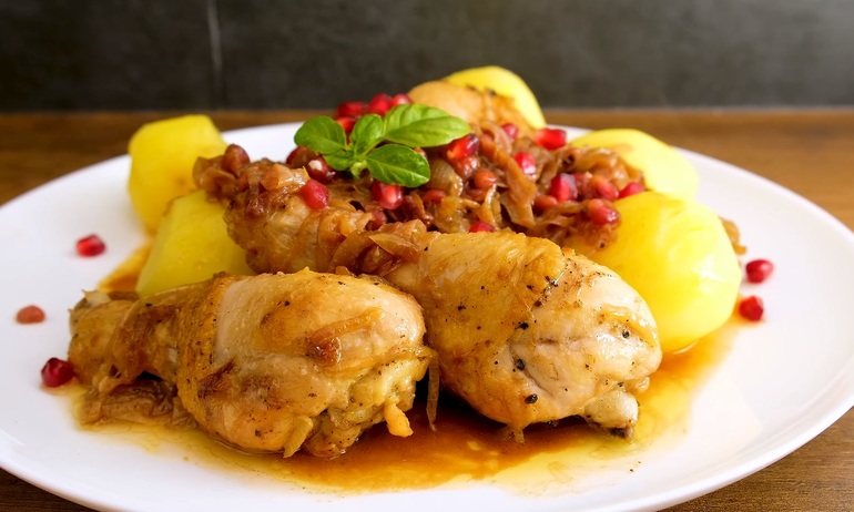 Хохоп - простое и быстрое горячее блюдо армянской кухни. Несмотря на свою простоту, выходит потрясающе вкусно: сочные куриные голени в сочетании с огромным количеством карамелизированного лука, легкой кислинкой от граната и нежностью сливочного масла. Как только я увидела этот рецепт, я уже не могла успокоиться, пока не приготовила. Подают это блюдо традиционно с отварным картофелем. При тушении получается очень вкусная подливка, которую можно вымакивать белым хлебом. Очень рекомендую приготовить в качестве быстрого ужина без заморочек, но также говорят, что это блюдо подают и на новогодние праздники, благодаря гранату оно действительно выглядит празднично.