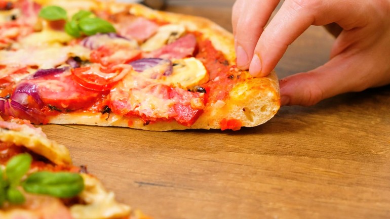 7. Корки готовой горячей пиццы можно смазать оливковым маслом, а можно этот шаг пропустить, сверху накрыть буквально на 2 минуты полотенцем, чтобы они размягчились. Тесто получается очень пышным и мягким, проверено неоднократно на личном опыте. Весь рецепт с подробностями смотрите, пожалуйста, в видео.