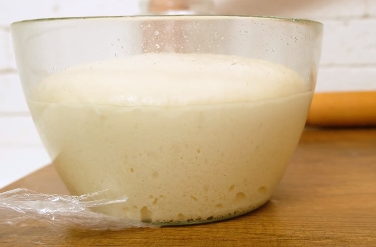 4. Тесто раскатываем в круг толщиной 0,5 см аккуратно, чтобы максимально сохранить сформировавшиеся пузырьки воздуха.