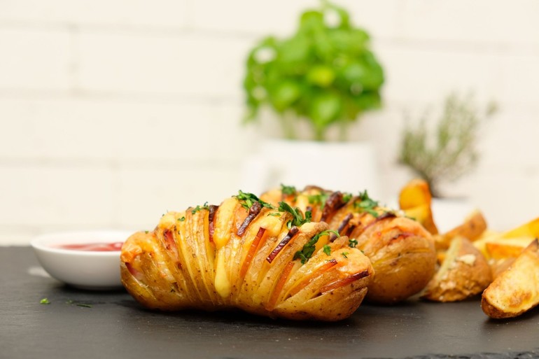 Второй рецепт - это, как мне кажется, полноценное и очень сытное основное блюдо: картошка-гармошка с сыром и беконом. Выглядит очень аппетитно, по вкусу просто нереально, а чего же еще ожидать от картофеля с беконом и сыром - такое блюдо нельзя испортить!