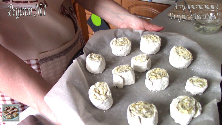 6. Тесто сворачиваю в рулет. Нарезаю его на кусочки шириной примерно 3 см. Каждый кусочек подравниваю и выкладываю на противень застеленный бумагой для выпечки . Бумагу маслом я не смазываю. Булочки на противне раскладываю на некотором расстоянии друг от друга, так как в процессе выпечки они увеличатся в объеме.