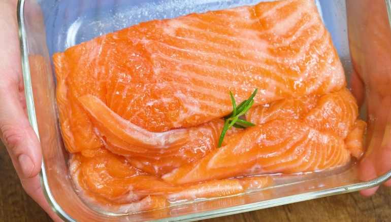 5. При засолке из красной рыбы выделяется жидкость под действием соли. Как только степень просола вас утраивает, эту жидкость нужно слить, а рыбу переложить в чистую стеклянную емкость или же подавать на стол.