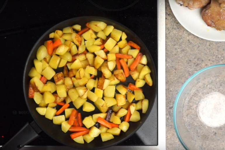 Нарезать картошки 700 г (все зависит от размера вашей сковороды) и морковку 1 шт. Обжарить 15 минут периодически помешивая.