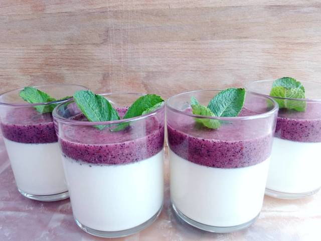 8.) Когда панна-котта полностью желетируется, сверху залить голубикой. Украсить всё можно листочками свежей мяты.