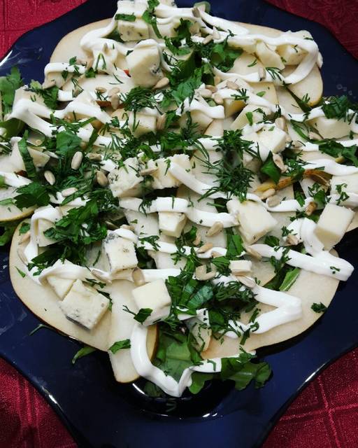3.) На блюдо выкладываем рукколу, затем груши, сыр, поливаем майонезом, посыпаем семечками и зеленью.