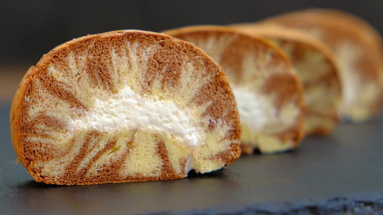 Готовое тесто аккуратно свернуть в рулет шоколадной стороной наружу и дать ему полностью остыть.