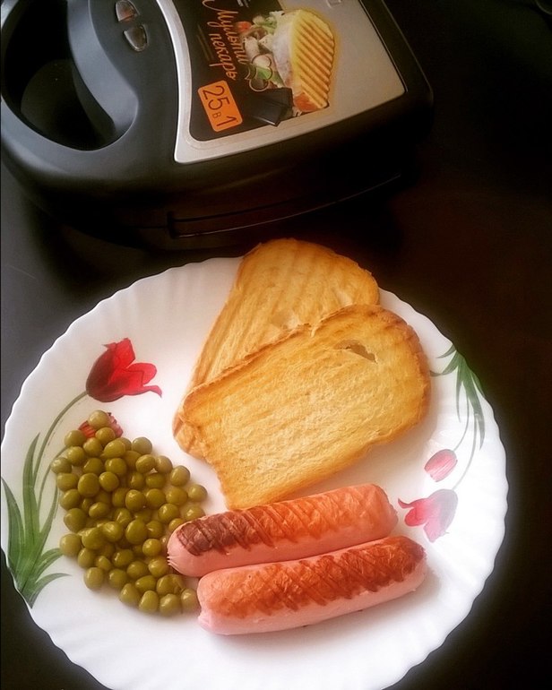 Перекусик - классические сосиски на гриль панелях, там же хлеб - ничем не хуже чем тостовый - можно чем нибудь намазать.