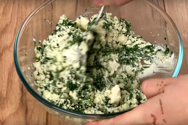 Первым делом разморозьте шпинат и откиньте его на сито, чтобы стекла лишняя жидкость. Сыр натрите на терке и смешайте со шпинатом, солью, перцем и сметаной.