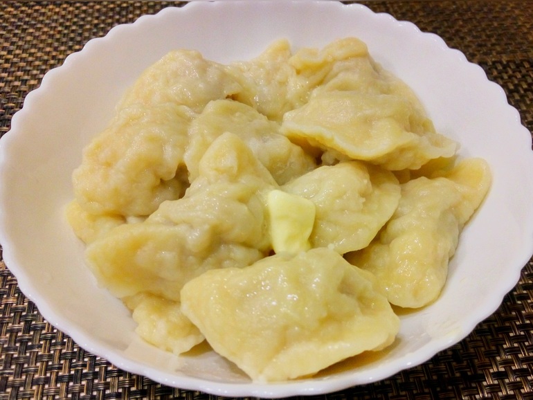 11. Когда они всплывут, поварите их еще 5-6 минут. Вареники с фаршем готовы. Выложите их в тарелочку, добавьте сливочное масло.
