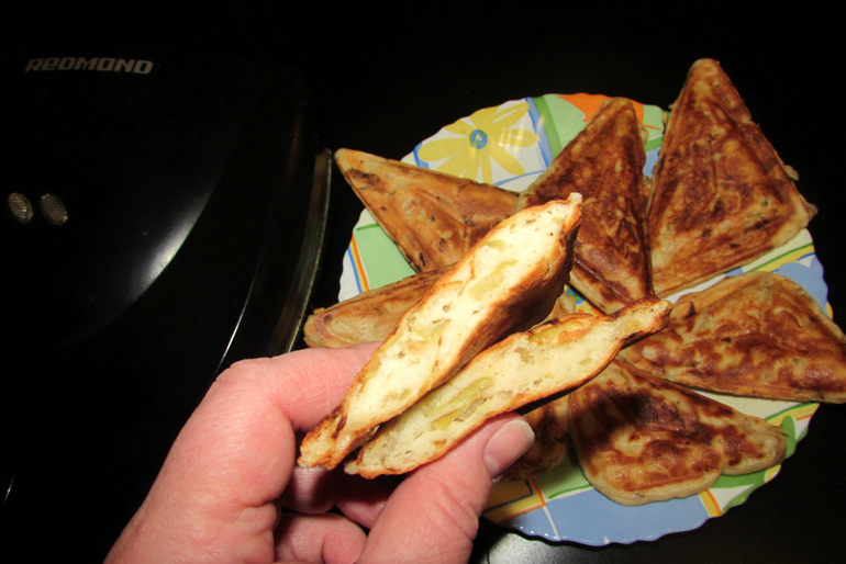 Тесто нужно наливать с небольшой горочкой. Если по центру треугольничка, то получаются небольшие пирожочки, а если распределить по панели - полноценные треугольники.