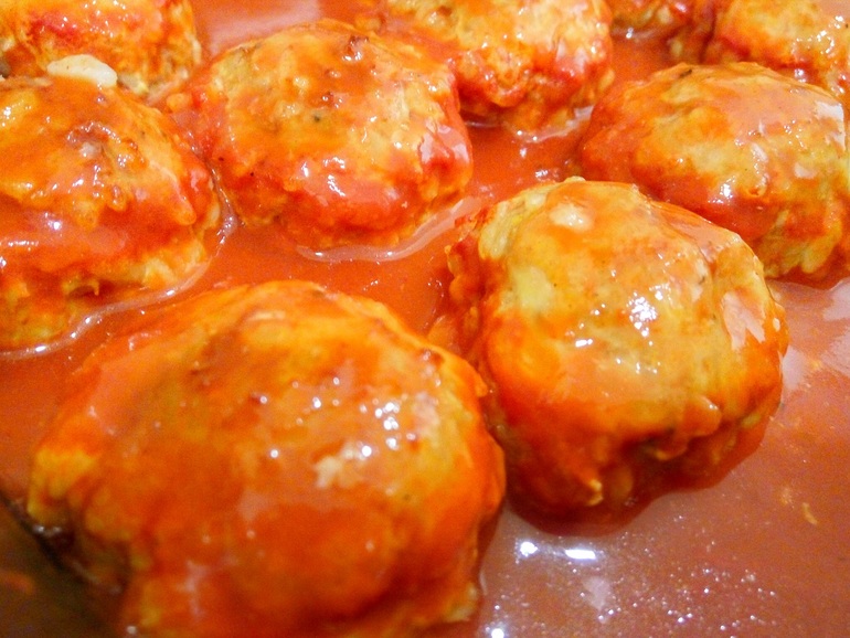4. Мокрыми руками формируем шарики из фарша и выкладываем на противень. Тефтели отправляем в духовку на 35 минут при температуре 200 градусов до появления едва золотистой корочки.