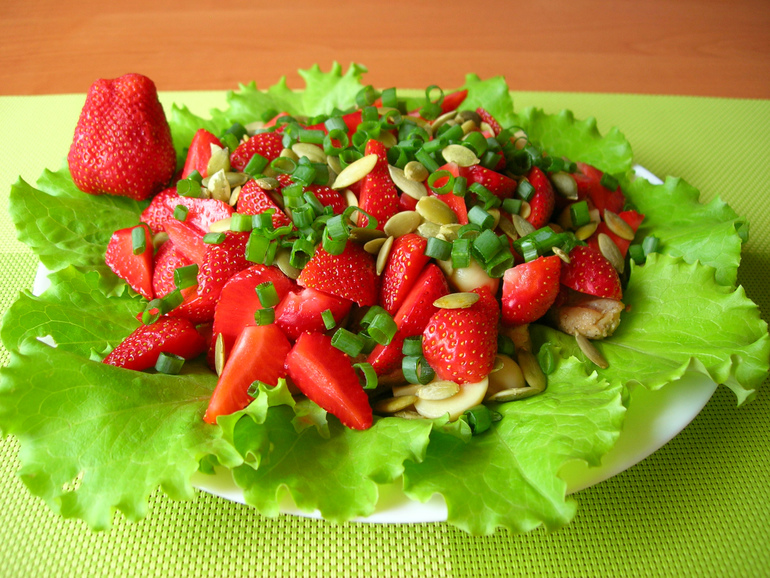 СалатыТакого салата вы не пробовали! Салат очень необычный, но очень вкусный. На первый взгляд кажется, что ингредиенты салата просто не сочетаемые, но очень рекомендую вам попробовать прежде, чем делать выводы. В сезон клубники этот салат регулярно появляется в моем повседневном меню, готовить его легко и просто, а получается вкусно и сытно!