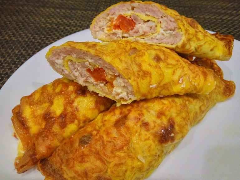 4. Помидор разрезать на небольшие дольки и выложить на край блина. Блин свернуть рулетиком.