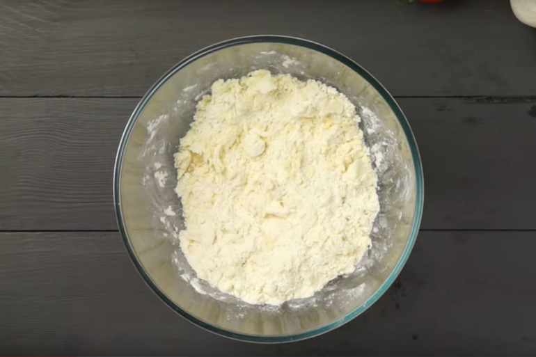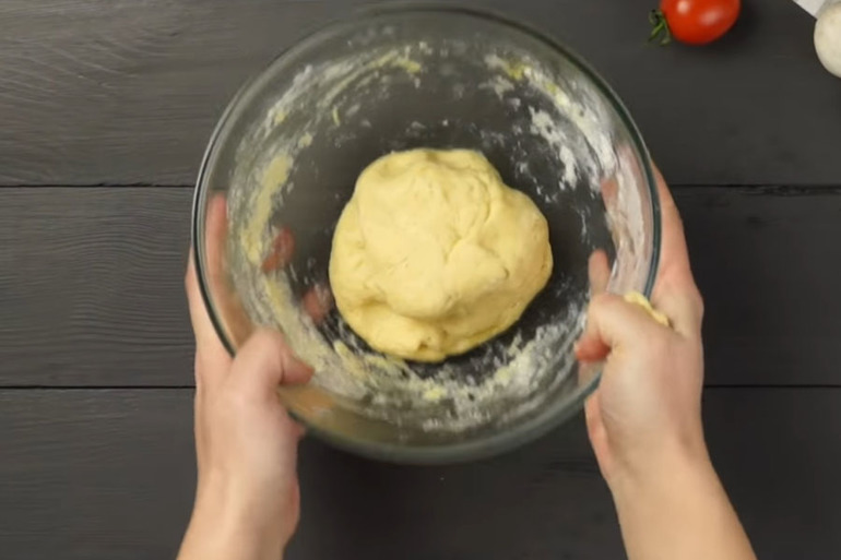 Добавьте соль, сахар, перец, разрыхлитель, яйцо и 3 столовые ложки воды. Замесите тесто.