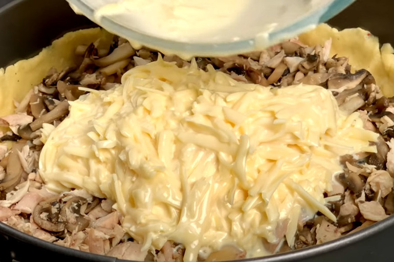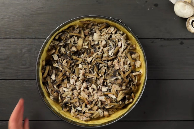 Для начинки возьмите грибы, обжарьте их на растительном масле 10-15 минут. Добавьте к ним вареное куриное филе. Еще обжарьте 5 минут. Достаем форму с тестом из холодильника и засыпаем начинку.