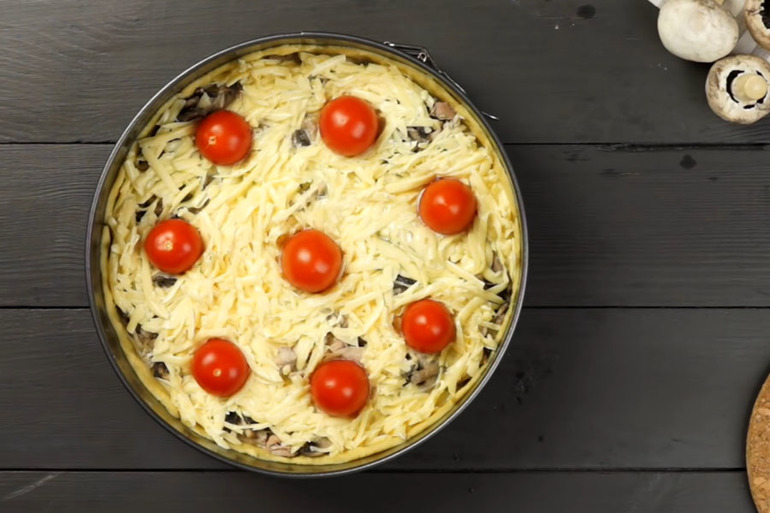 Нарезаем 4 помидора черри на половинки, украшаем наш пирог. Отправляем в духовку на 30 мин при температуре 180 градусов.