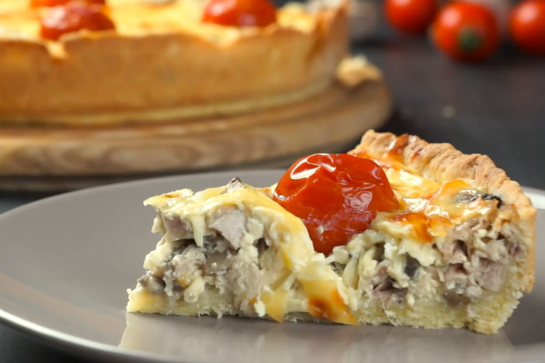 Чтобы приготовить киш с курицей и грибами возьмите такие ингредиенты: