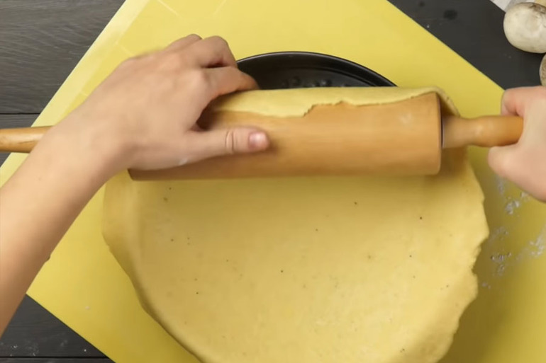 Раскатайте тесто на нужный Вам диаметр формы + борта пирога, в моем случае 24 см. Застелите тесто в форму и отправьте в холодильник, а тем временем приготовим начинку.