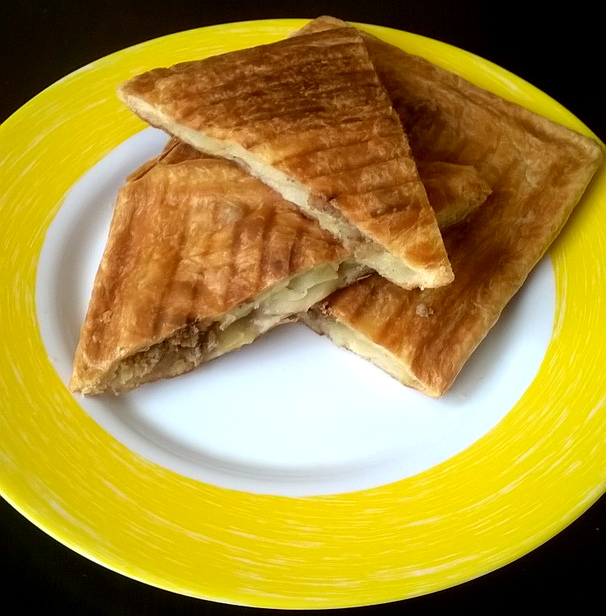 Собираем пирог -1/4 пласта теста раскатываем, выкладываем слой картошки, слой фарша, закрываем второй четвертинкой теста, защипываем края и отправляем на панели на 10 минут.