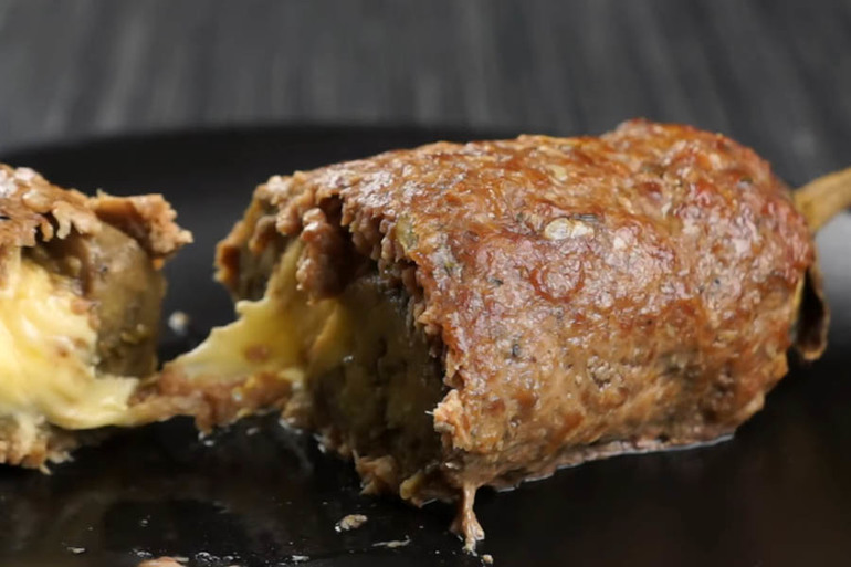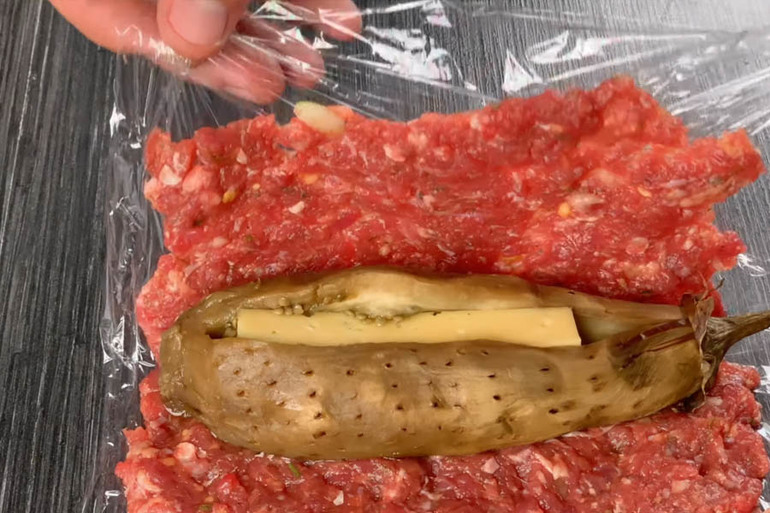 Выкладываем пищевую пленку на стол, на неё выкладываем тонким слоем фарш, потом баклажан, делаем надрез и укладываем сыр. Заворачиваем фарш и отправляем в духовку на 30 минут при температуре 180°C