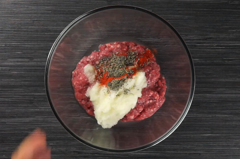 Тем временем вымесим фарш с луковым пюре и специями.