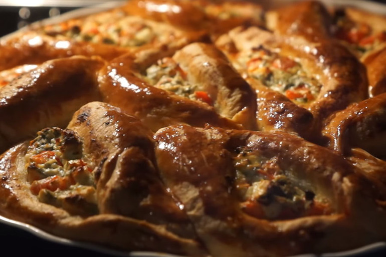 От теста отщипните кусочки весом по 100 г и укладывайте начинку, формируя лодочку. Выложите все булочки в форму диаметром 28 см.